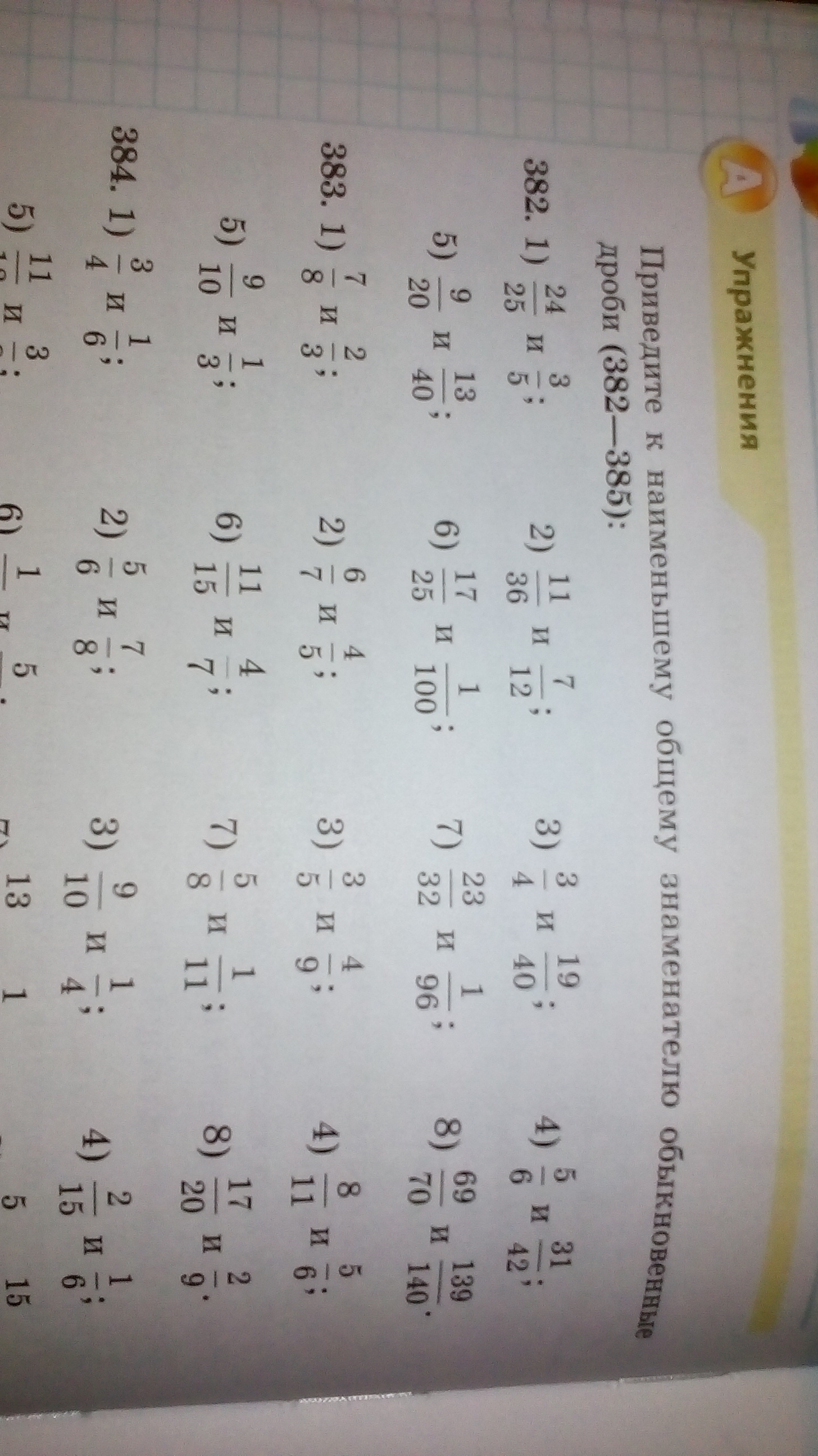 Приведите к наименьшему общему знаменателю обыкновенные дроби номер 382