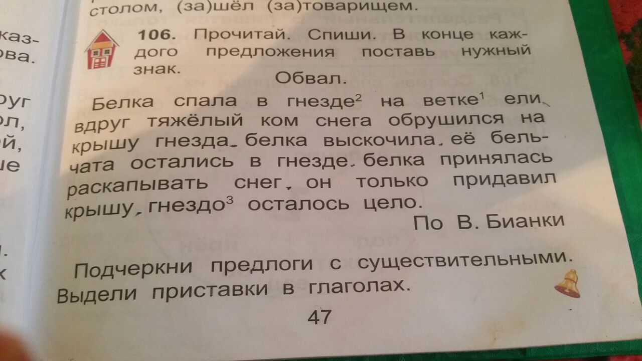 Подчеркивай предлоги с существительными: В гнезде,на ветке,на крышу,в гнезде.