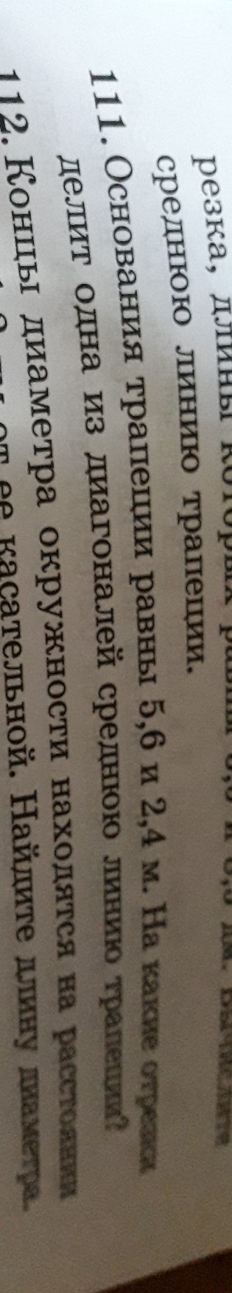 ответ: диагональ в трапеции делит среднюю линию на отрезки 1,2м и 2,8м
