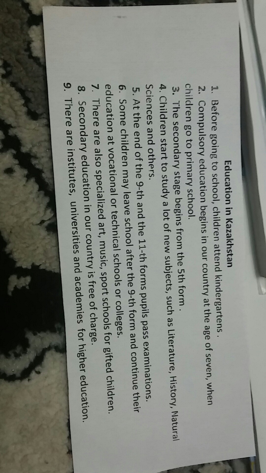 Образование в Казахстане 1 до того, как дети поселятся в детском саду. 2. Обучение в школе начинается в нашей стране в возрасте семи лет, когда дети ходят в начальную школу. 3. Вторичная стадия деградации от 5-го из 4-х детей начинает изучать множество новых предметов, таких как Литературная история Естественные науки и другие 5 в конце 9-го и 11-го учеников сдают экзамены 6 Некоторые дети могут покинуть школу после 9-го из конца, продолжая обучение в профессионально-технических училищах коллегистов 7 Существуют также специализированные школы музыкальной школы-шпица для одаренных детей 8 Среднее образование в нашей стране бесплатно 9 есть институты, университеты и академии для высшего образования