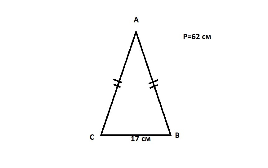 По условию треугольник ABC - равнобедренный, откуда получаем, что AB=AC=(62-17)/2=22,5 см