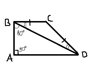 В общем примерно такой рисунок,в основу всего решения входит то,что сумма всех углов треугольника равна 180°, находим ∠ADB= 180-90-80=10°, находим ∠DBC=90°-80°=10°,так как BC=CD,то ∠DBC=∠CDB=10°,отсюда находим ∠BCD=180-10-10=160°,остается только ∠ADC=∠ADB+∠BDC=20°,Проверяем 90°+90°+20°+160°=360°.