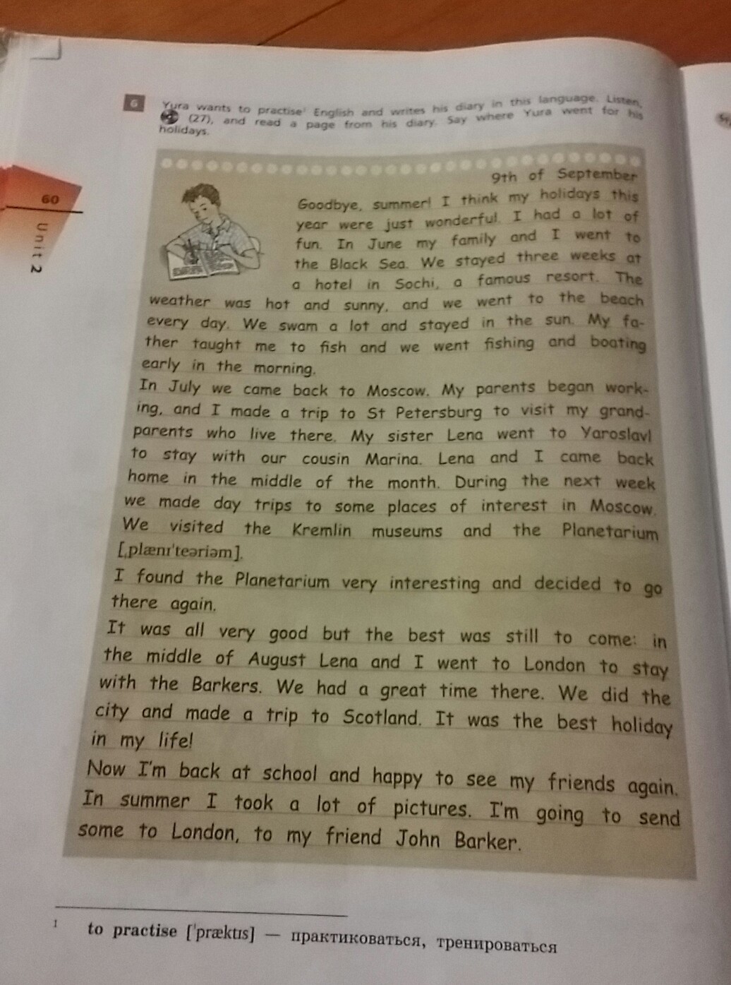 Сейчас я вернулся в школу и счастлив снова повидать своих друзей. Я сделал много фотографий летом. Я отправлюнесколько фото в Лондон, мой дорогой друг Джон Баркер.