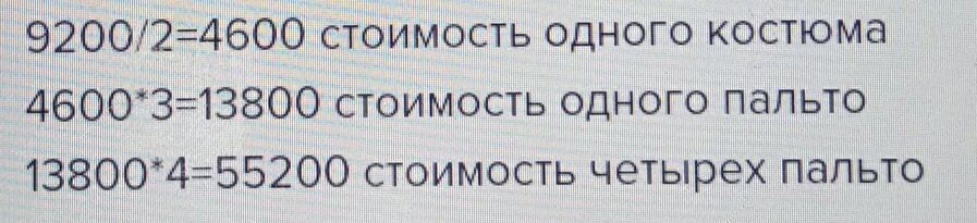 За два одинаковых костюма заплатили 9200 тг. Один костюм в 3 раза дешевле, чем одно пальто. Какова стоимость четырёх пальто?