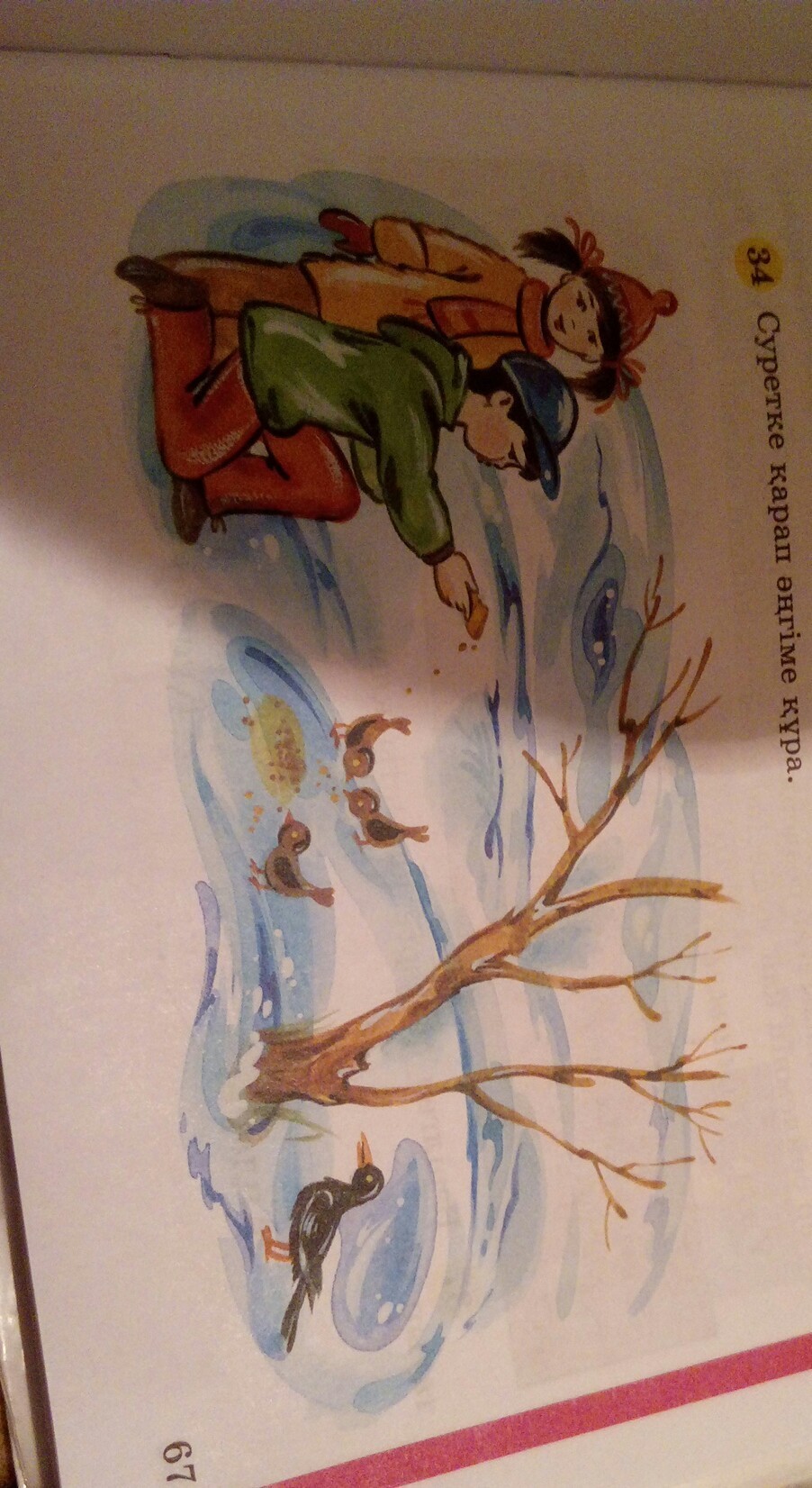 Қыстын бір кү ні . Ағаштар да жапырақтар жоқ .Құстар жерден дән тауып жеп жатыр .