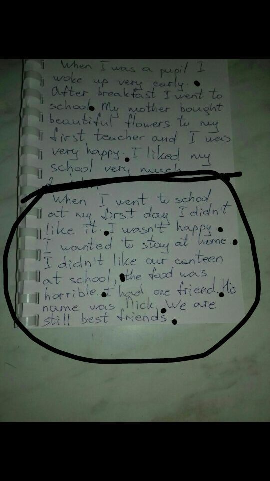 Когда я пришел в школу в первый день она мне не понравилась. Я не был счастлив. Я хотел остаться дома. Мне не понравилась наша столовая, еда была ужасная. У меня был один друг. Его звали Ник. Мы до сих пор лучшие друзья.