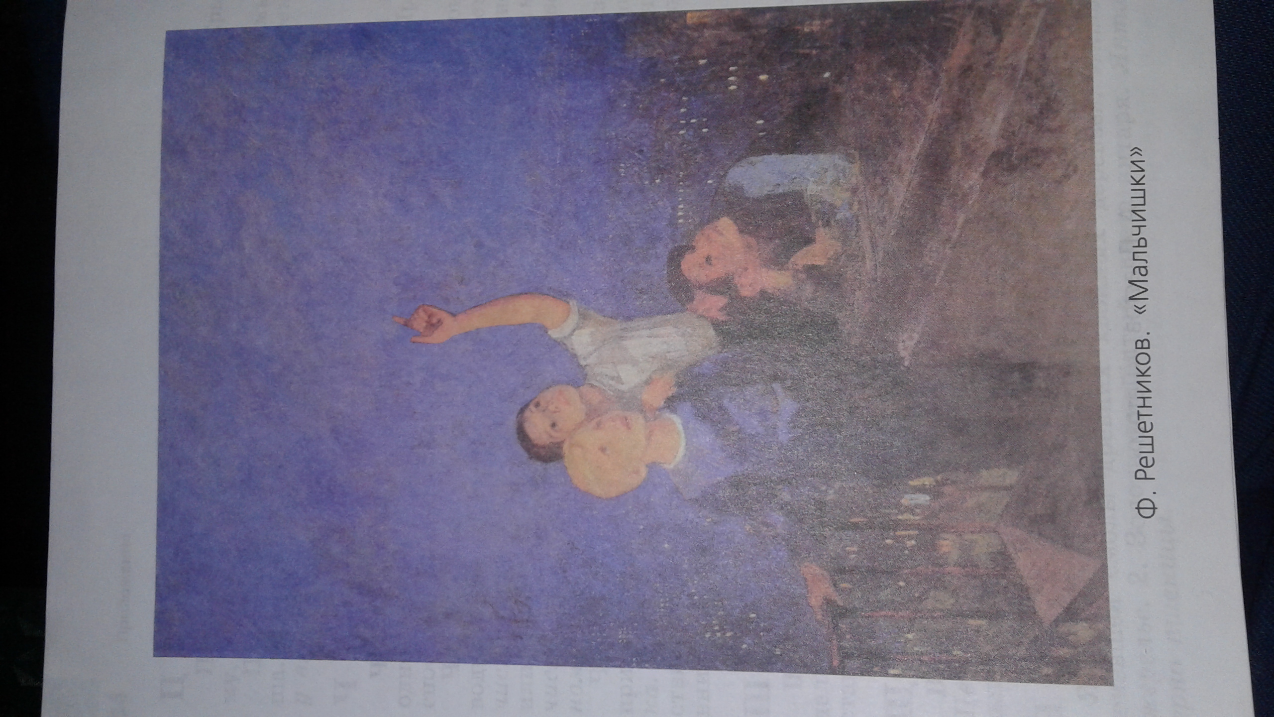На картине Ф. Решетникова «Мальчишки» изображены три мальчика, которые в тихую летнюю ночь взобрались на крышу дома. Они наблюдают за звёздным небом. Один облокотился на парапет, второй стоит держась за перила, а третий положил руку одному из своих друзей и о чём-то рассказывает, указывая рукой на звёзды. По-видимому, он очень увлечен астрономией. Может быть, он рассказывает о созвездиях или о том, есть ли жизнь на других планетах. Другому мальчику интересен его рассказ, и он с заинтересованным лицом смотрит на небо. А третий их товарищ о чём то мечтает. Его лицо спокойно и задумчиво.