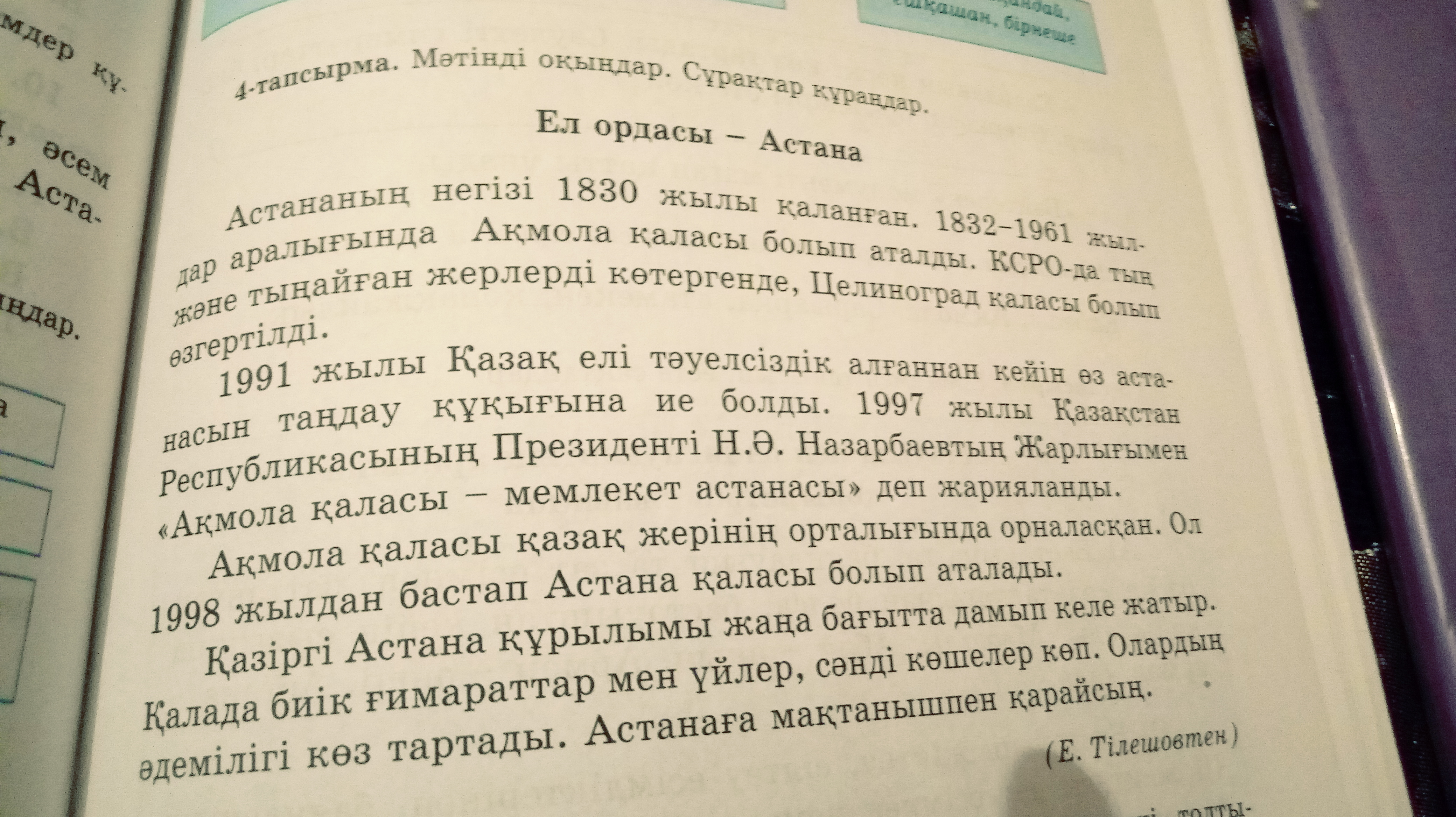 г. Акмола расположен в середине Казахстана. с 1998 года он стал называться г. Астана. Сейчас Астана продвигается вперёд в будущее. Туда построили высокие дома, здания. Их красота радует глаза. Приятно смотреть на Астану.