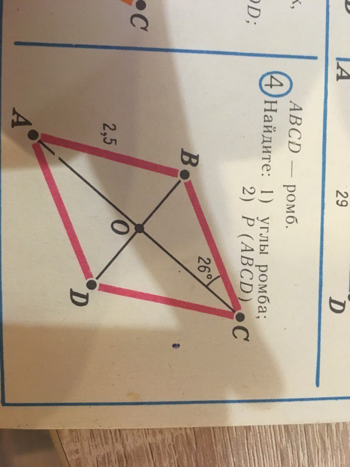 1)По свойству диагоналей ∠ВСD=∠OCD=26°. Значит ∠С=26·2=52°. ∠А=∠В=∠С=∠D=52°/