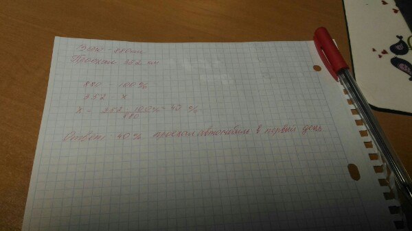 автомобиль должен проехать 880 км В первый день он проехал 352км. сколько процентов от всего пути проехал автомобиль в первый день?