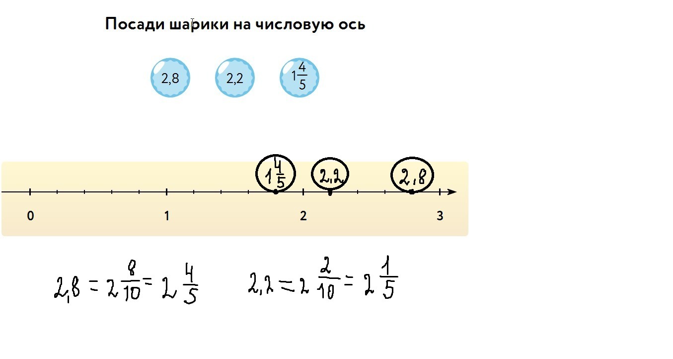 сначала мы садим 1целую 4/5 после единицы,затем после двойки садим 2,2 ,затем после 2,2 садим 2,8