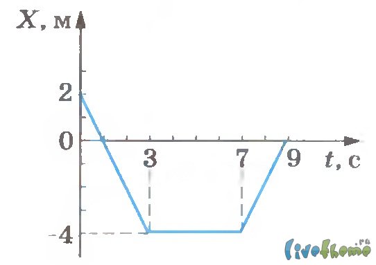 На рисунке изображен график зависимости координаты от времени для точки, движущейся вдоль оси ОХ. Опишите движение точки в интервалах времени от 0 до 3 с, от 3 до 7 с, и от 7 до 9 с. Постройте графики для модуля и проекции скорости в зависимости от времени. Начертите график зависимости пути от времени.