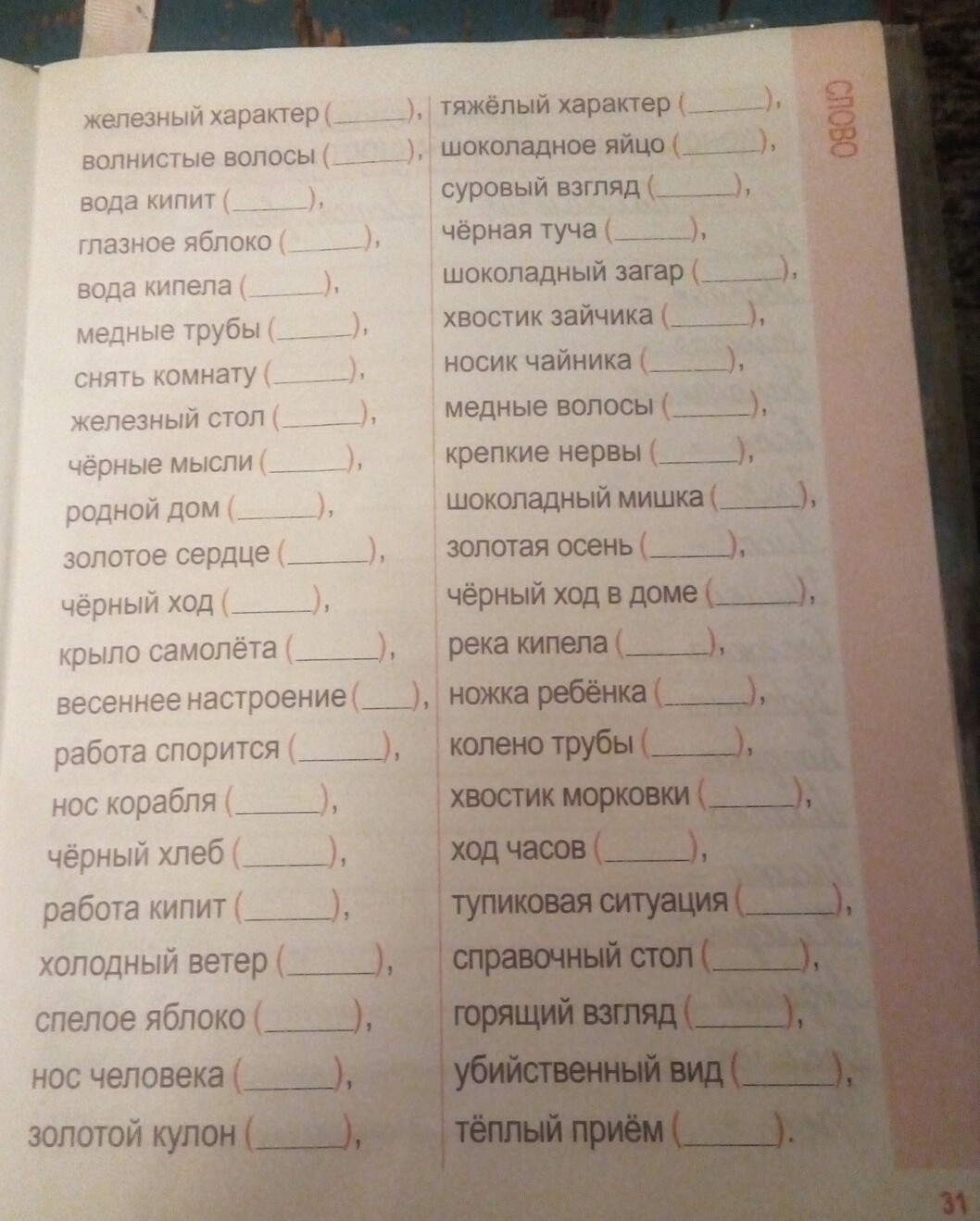 Железный характер ;глазное яблоко;снять комнату;чёрное мысли;золотое сердце;работа спорится;нос корабля;работа кипит;тяжелый характер;суровый взгляд;шоколадный загар;носик чайника;медные волосы;крепкие нервы;золотая осень;река кипела;колено трубы;хвостик морковки;ход часов;тупиковая ситуация;справочный стол;горящий взгляд;убийственный взгляд;тёплый приём