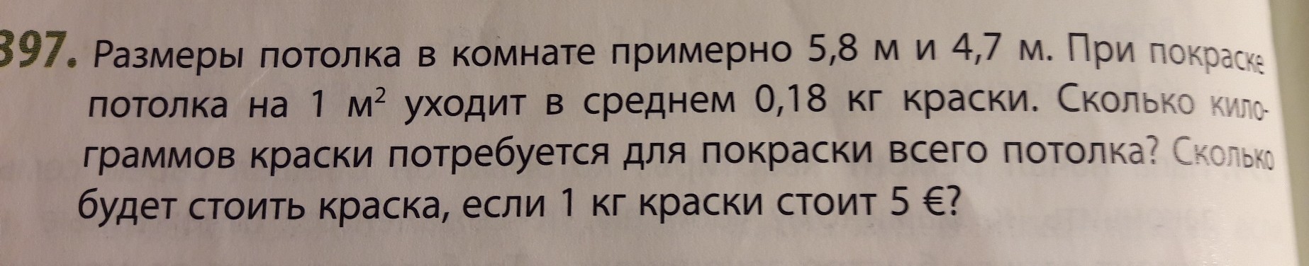 5,8*4,7=27,26 м2 площадь потолка 27,26*0,18=4,9068 кг краски понадобится 4,9068х5=24,534 евро понадобится или 4,9068=округл 5 кг*5=25 евро, если покупать банку 5 кг