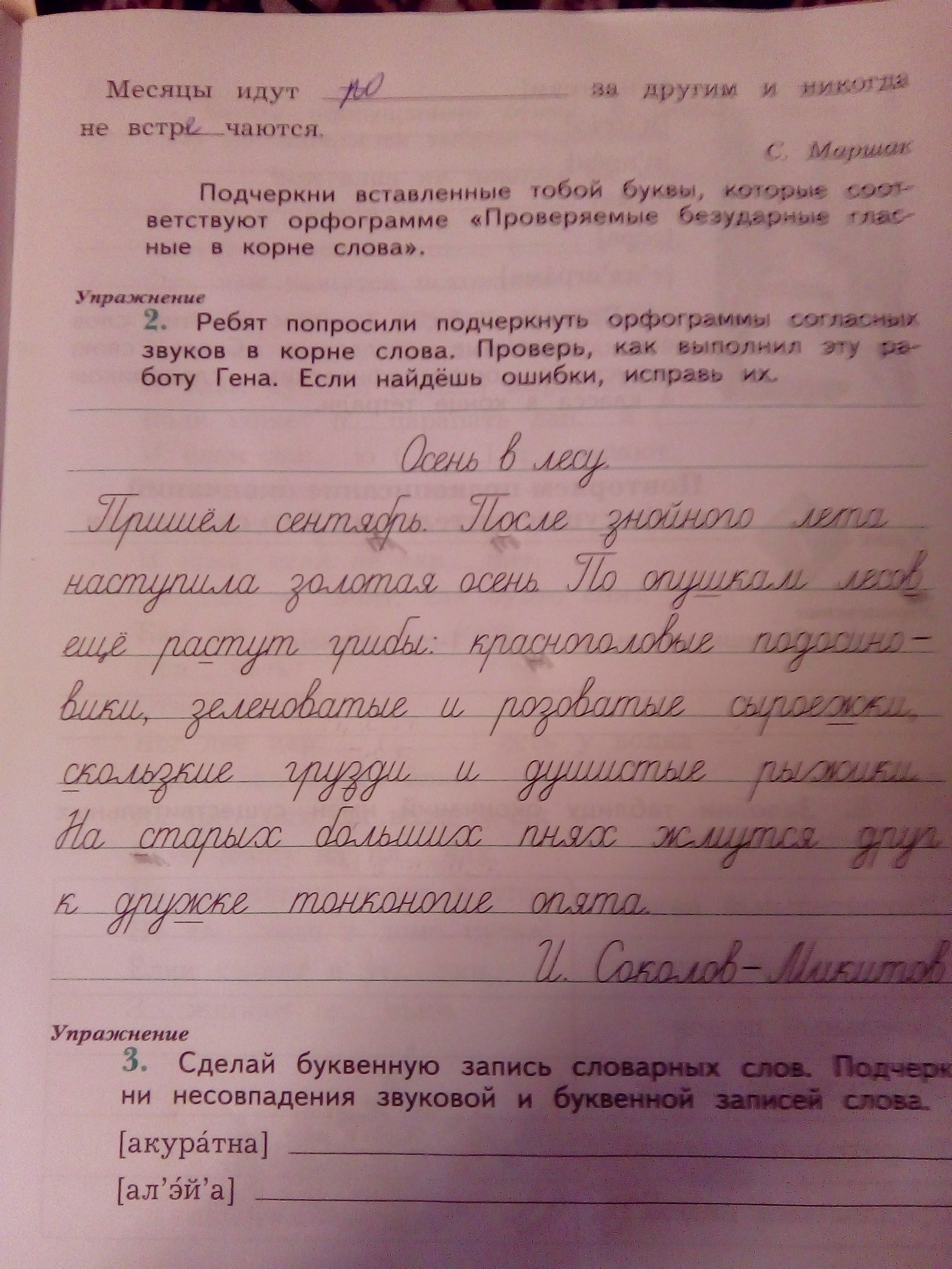 ребята попросили подчеркнуть орфограммы согланых звуков в корне слова. проверь как выполнил эту работу Гена. если найдешь ошибки, исправь их.