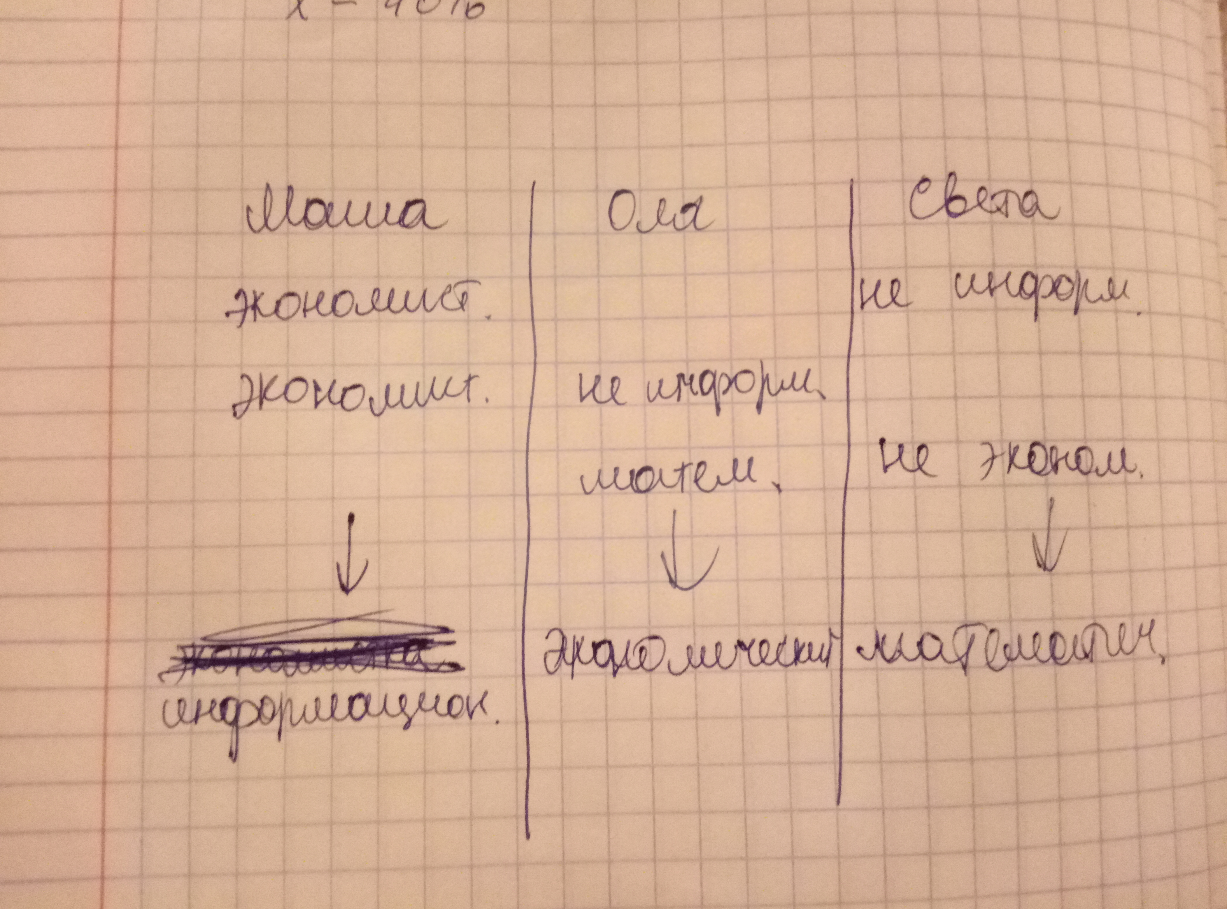 Три подруги - Маша, Оля и Света – поступили в лицей в экономический, информационный и математический классы. Если Маша экономистка, то Света не информатик. Если Оля не информатик, то Маша экономистка. Если Света не экономистка, то Оля – математик. Определите, в какие классы поступили девочки. Известно, что каждая девочка поступила в один класс, и классы различны.