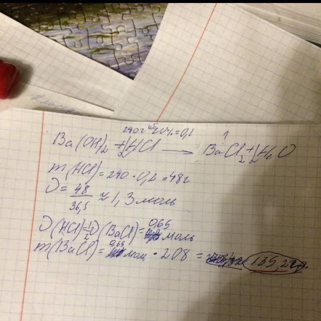 Обчислите массу средней соли , которая получилась впоследсвии взаимодействия 240г 20% раствора соляной кислоты с барий гидроксидом.