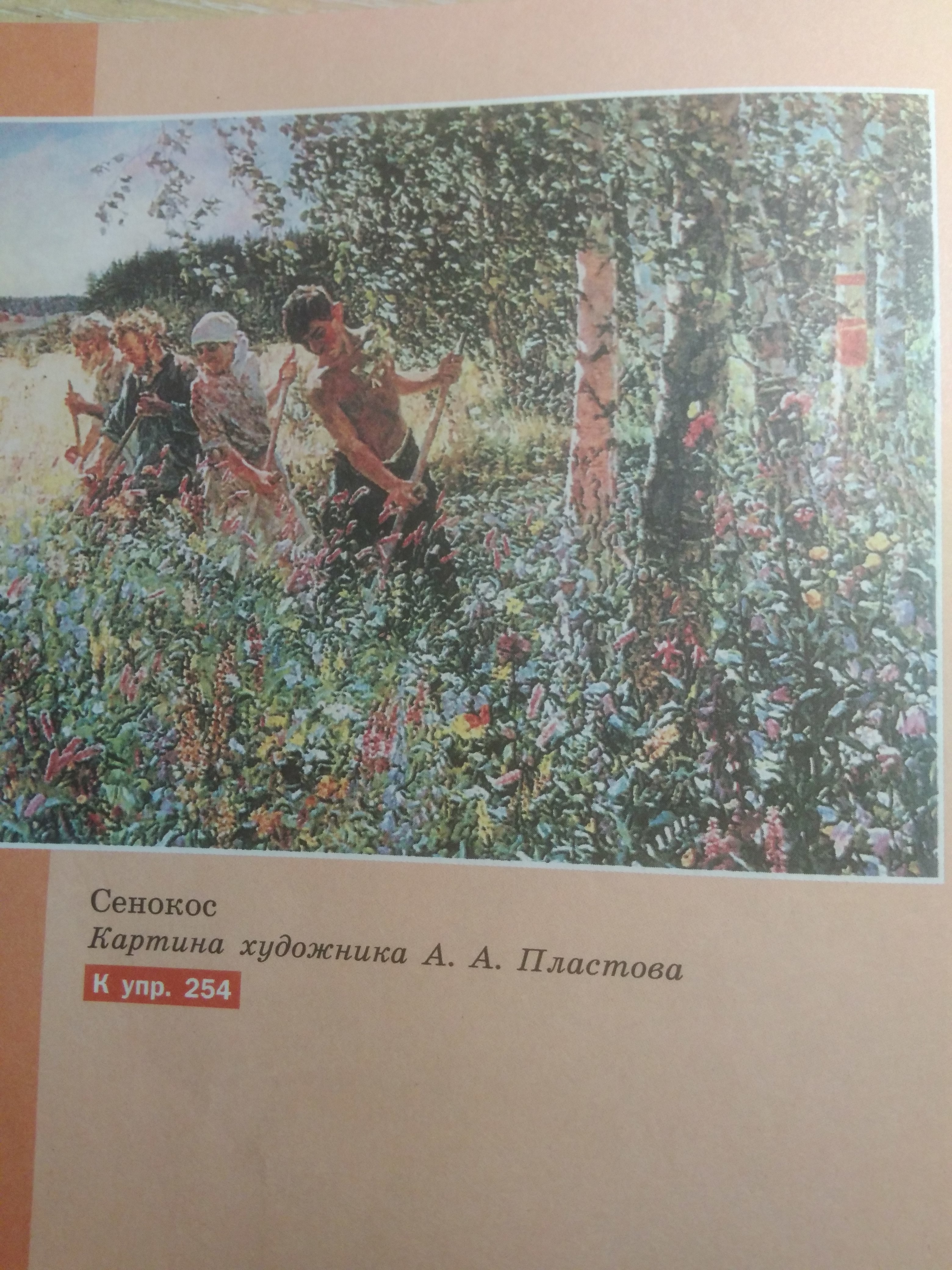 Перед нами картина А.А Пластова «Сенокос». На этой картине художник изображаетобычныэ крестьянских людей, которая косят траву. По ярким цветам зелени, цвето и деревьв мы видим, что на картине лето. Само действие происходит где - то за деревней около леса. Картина очень насыщена красками, а еще мне понравилось то, как художник показал людей. Видимо, эти люди косят сено для зимы, потому что трава хорошо горит и ей можно затопить печь или покормить скот. Смотря на эту картину, я, как будто, вникаю в нее, с помощью ярких красок представляю отчетливо крестьянскую жизнь.