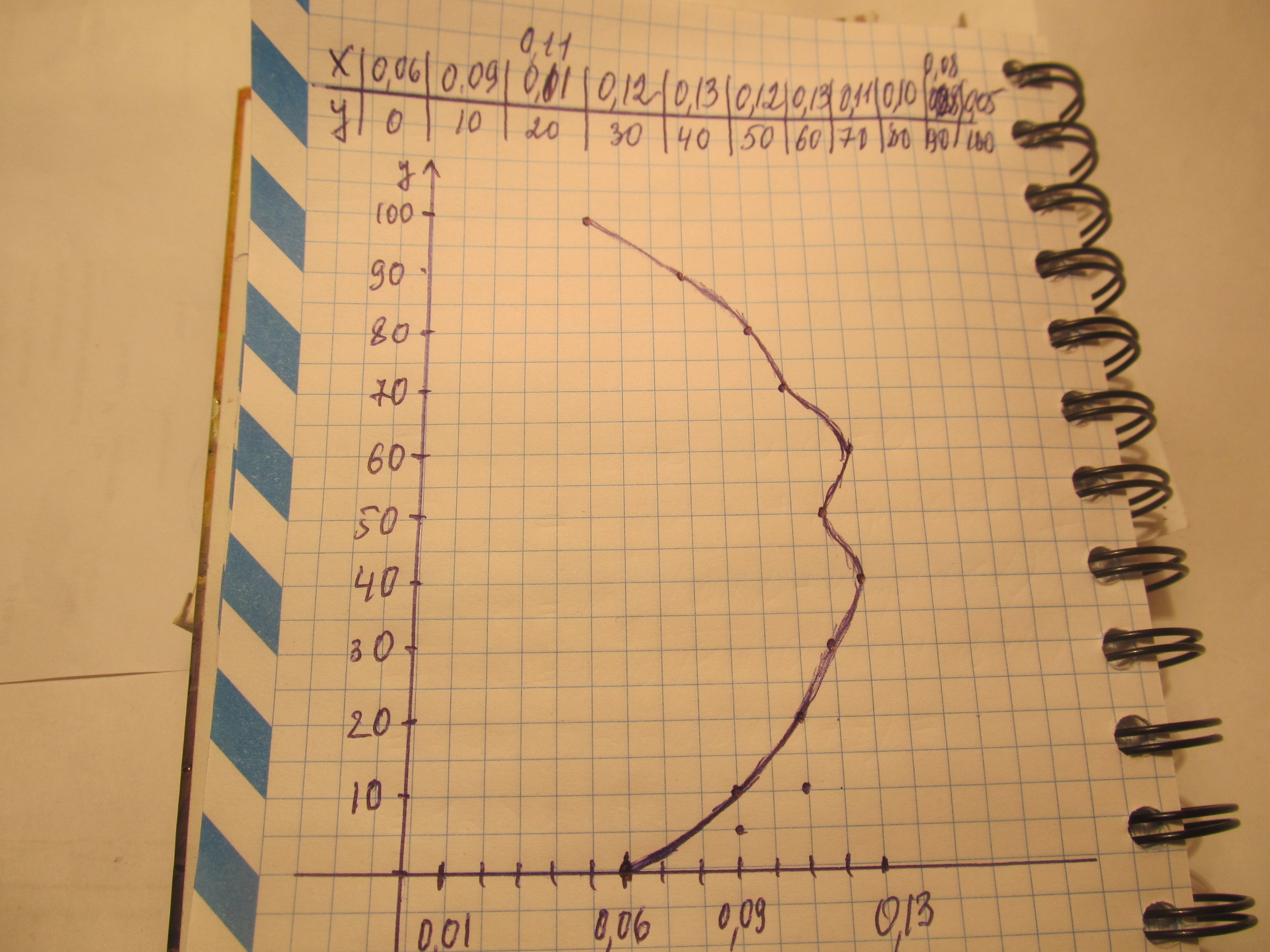 выбрать масштаб и построить график, значение х= 0,06; 0,09;0,11; 0,12; 0,13; 0,12;0,13;0,11;0,10;0,08;0,05 а у=0,10,20,30,40,50,60,70,80,90,100