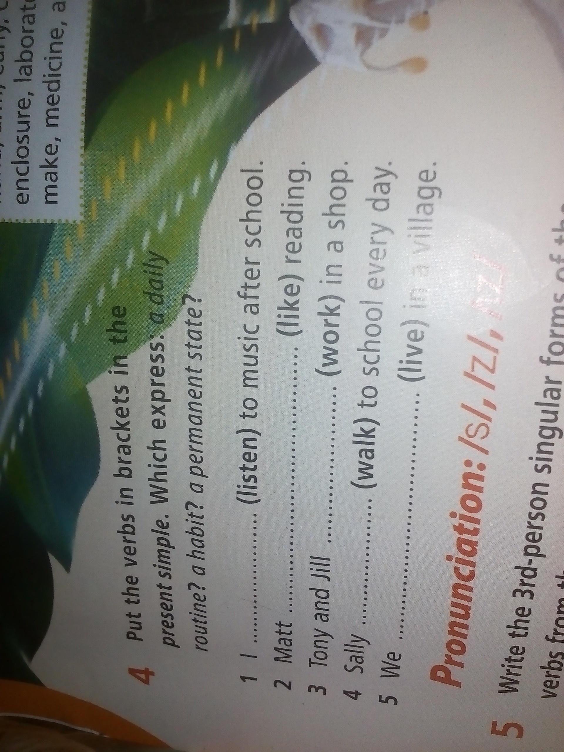 4 Поместите глаголы в скобки в настоящем простом. Какой экспресс: ежедневная рутина? привычка? постоянное государство? 1 Я (слушаю) музыку после школы (как) чтение. Тони и Джилл (работа) в магазине. Салли (прогулка) в школу каждый день. (жить) в деревне.