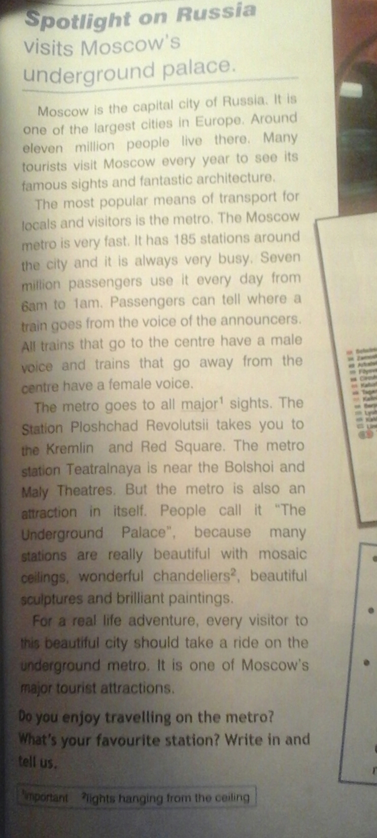The Moscow metro is the most popular means of transport. It is very fast and always very busy. There are 164 stations. Seven million passengers use it every day.