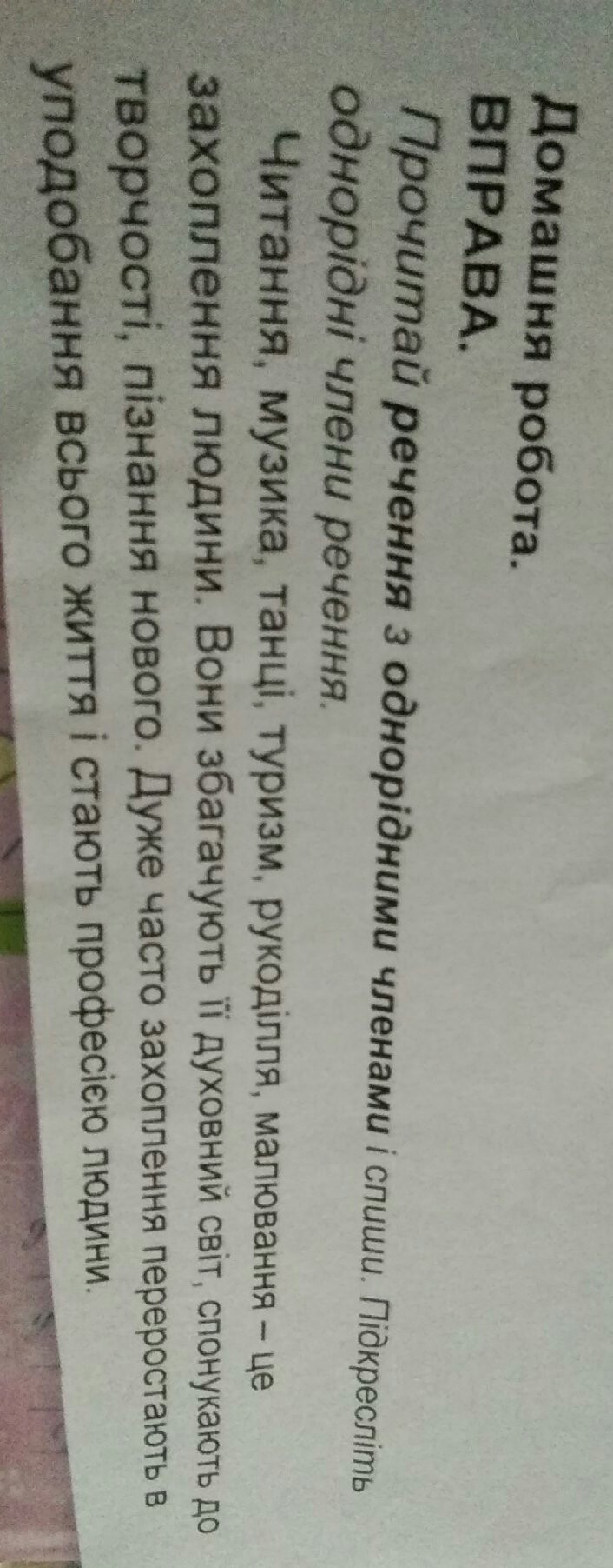 1 речення, однорідні: читання, музика, танці, туризм, рукоділля, малювання.
