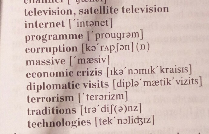1-Телевидение Спутниковой Телевидение 2-интернет 3 программа 4-коррупция 5-массивный 6 экономический кризис 7-дипломатический визит 8-терроризм 9-традиции 10-технологии)