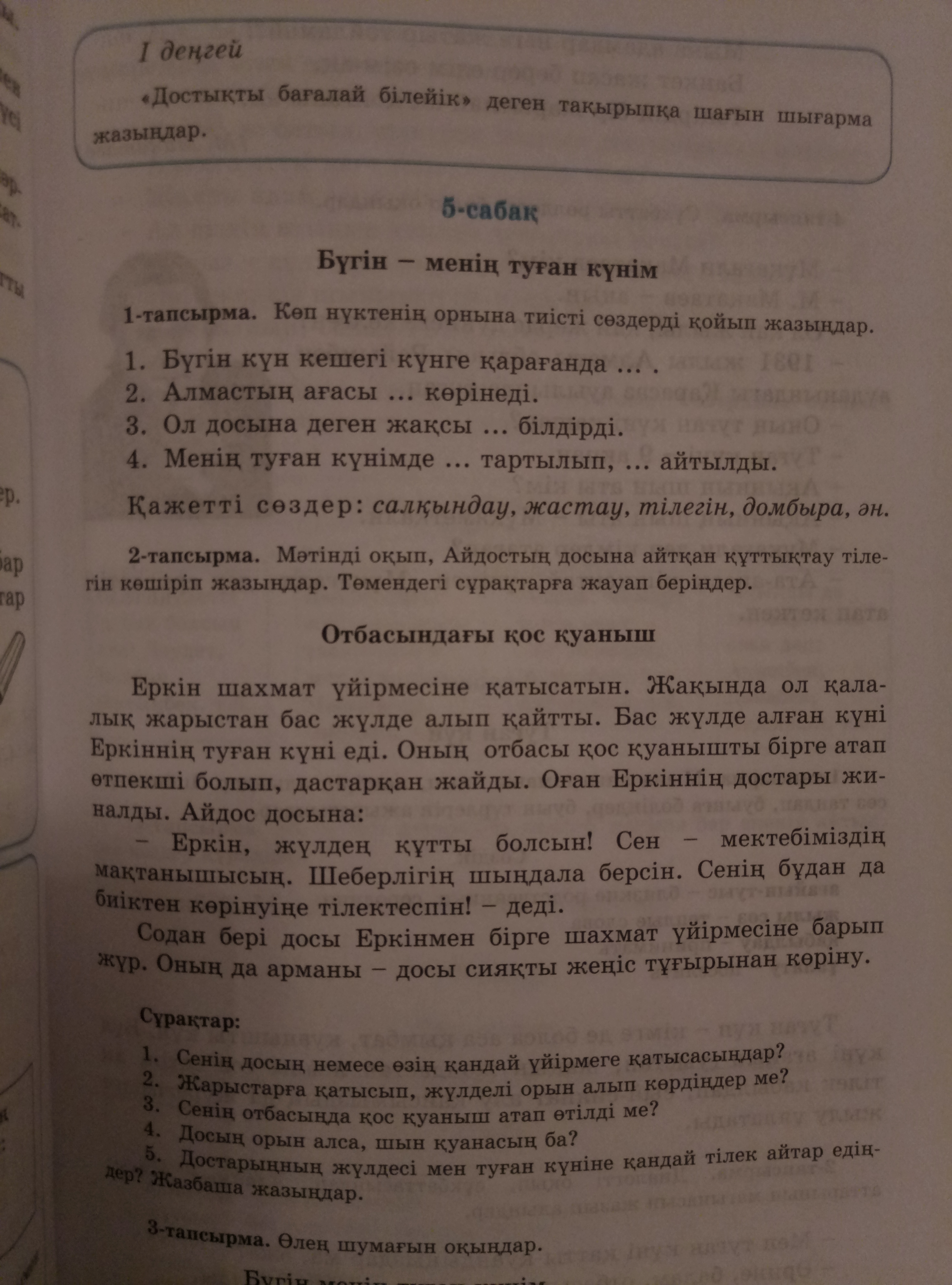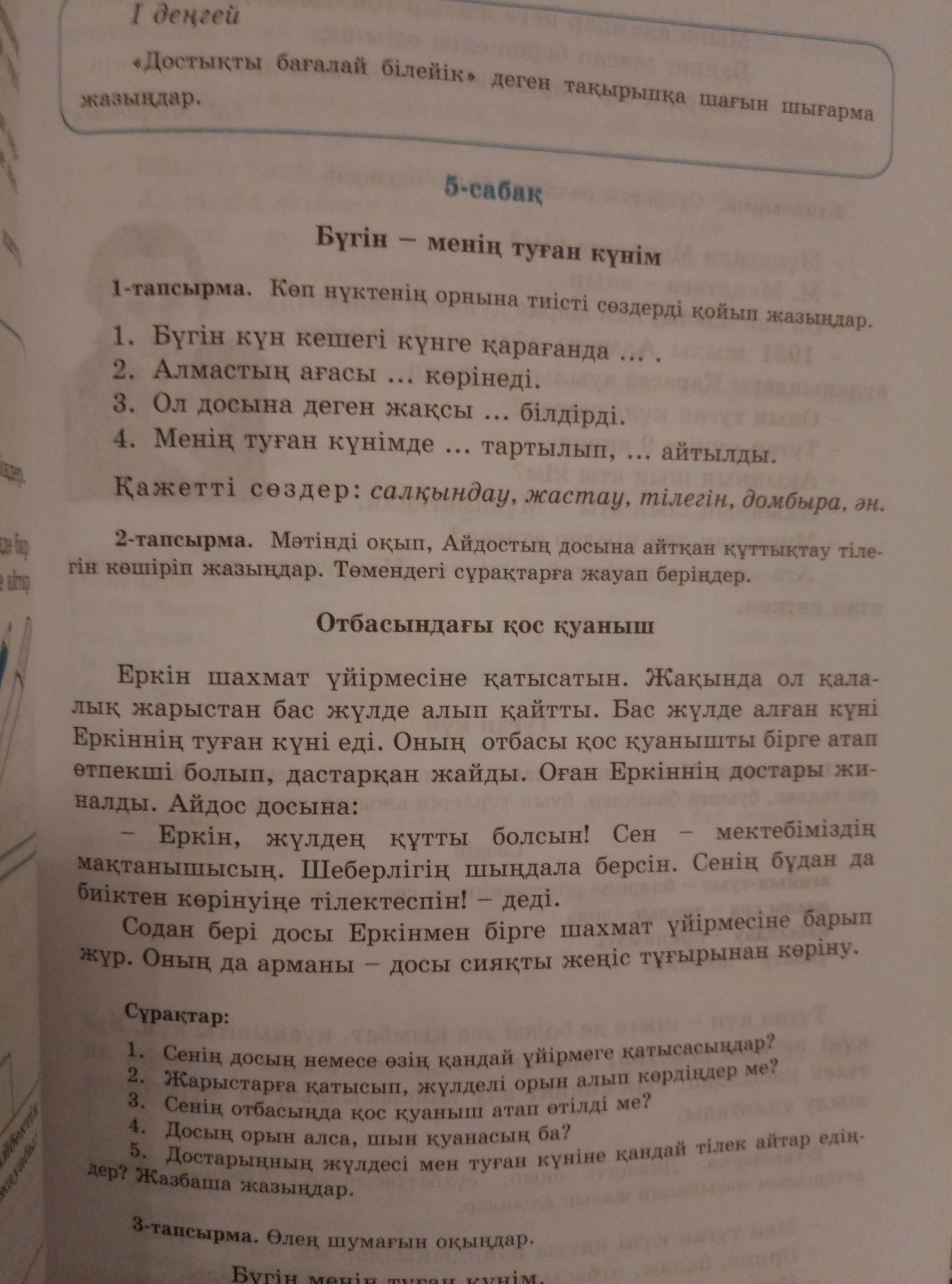 1) Бүгін кешегі күнге қарағанда салқындау. Алмастың ағасы жастау көрінеді.Ол досына деген жақсы тілегін білдірді. Менің туған күнімде домбыра тартылып ән айтылды.