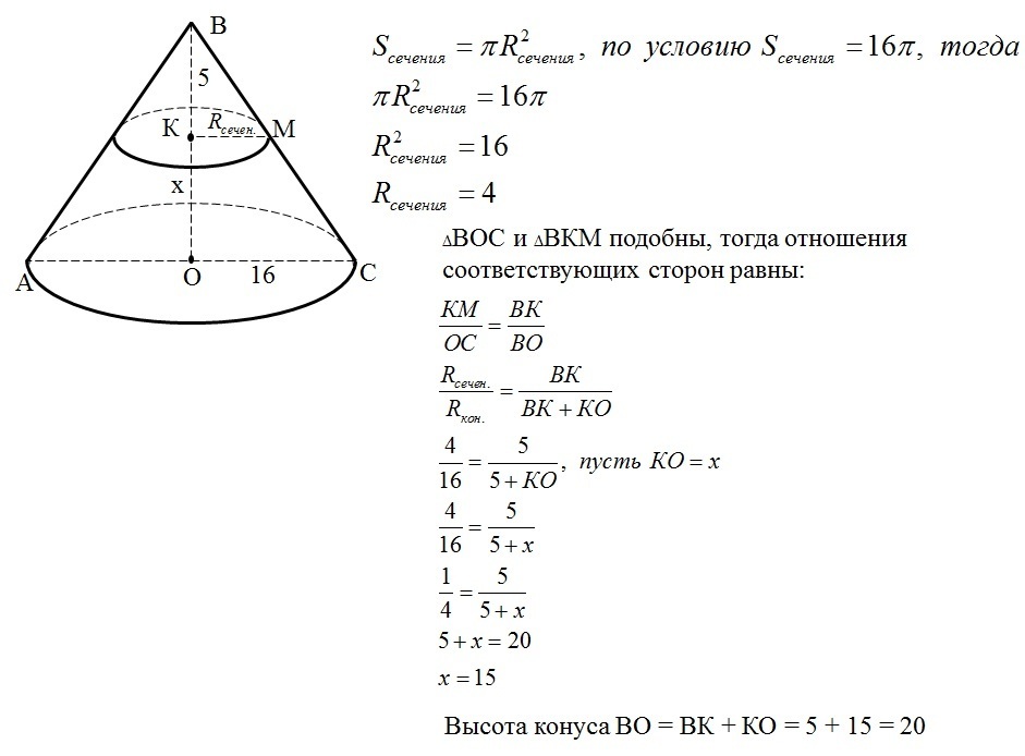 Радиус основания конуса равен 16 см. Параллельно плоскости основания проведено сечение, площадь которого равна 16π см^2. Найдите высоту конуса, если сечение удаленный от вершины конуса на 5 см.