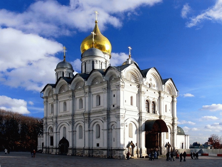 Архангельский собор в Кремле — православный храм, расположенный на Соборной площади Московского Кремля.Первый деревянный Архангельский собор в Кремле возник на месте нынешнего, возможно, ещё во время княжения Михаила Хоробрита, брата Александра Невского, в 1247-1248 годах. В 1333 году, за одно лето, Иван Калита построил новый каменный храм — по обету, в благодарность за избавление Руси от голода, вызванного пошедшей в рост и не давшей зёрен рожью. Новый Архангельский собор был освящён митрополитом Феогностом 20 сентября 1333 года. Существующий собор был сооружён в 1505—1508 гг. под руководством итальянского зодчего Алевиза Нового на месте старого собора XIV века. С 1599 года по 1765 год при соборе состояли особые архиереи, обязанностью которых было совершать панихиды во дни поминовения князей и царей. С 1743 года по 1883 год был кафедральным храмом Московской епархии. Указом Николая II от 13 января 1895 года был передан в придворное ведомство.Храм пятиглавый, шестистолпный, пятиапсидный, восьмипридельный с узким, отделённым от него стеной помещением в западной части (на втором ярусе — хоры, предназначавшиеся для женщин царской семьи). Выстроен из кирпича, декорирован белым камнем. В обработке стен широко использованы мотивы зодчества итальянского Возрождения (ордерные пилястры с растительными капителями, «раковины» в закомарах, многопрофильные карнизы).