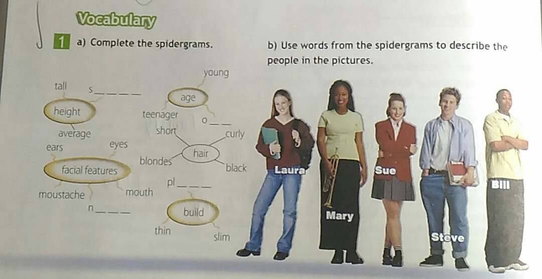 а) small (height) , old (age), nose (fac. feat.), plump (build)