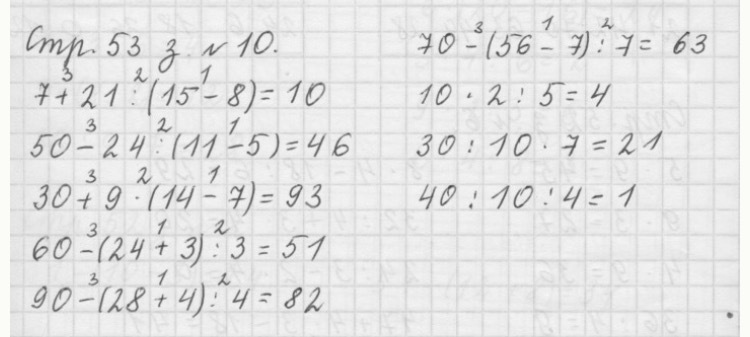 (7+21):(15-8)=4 50-24:(11-5)=13 30+9*(14-7)=273 60-(24+3):3=11 90-(24+8):4=14 70-(56-7):7=3 10*2:5=4 30:10*7=21 40:10:4=1