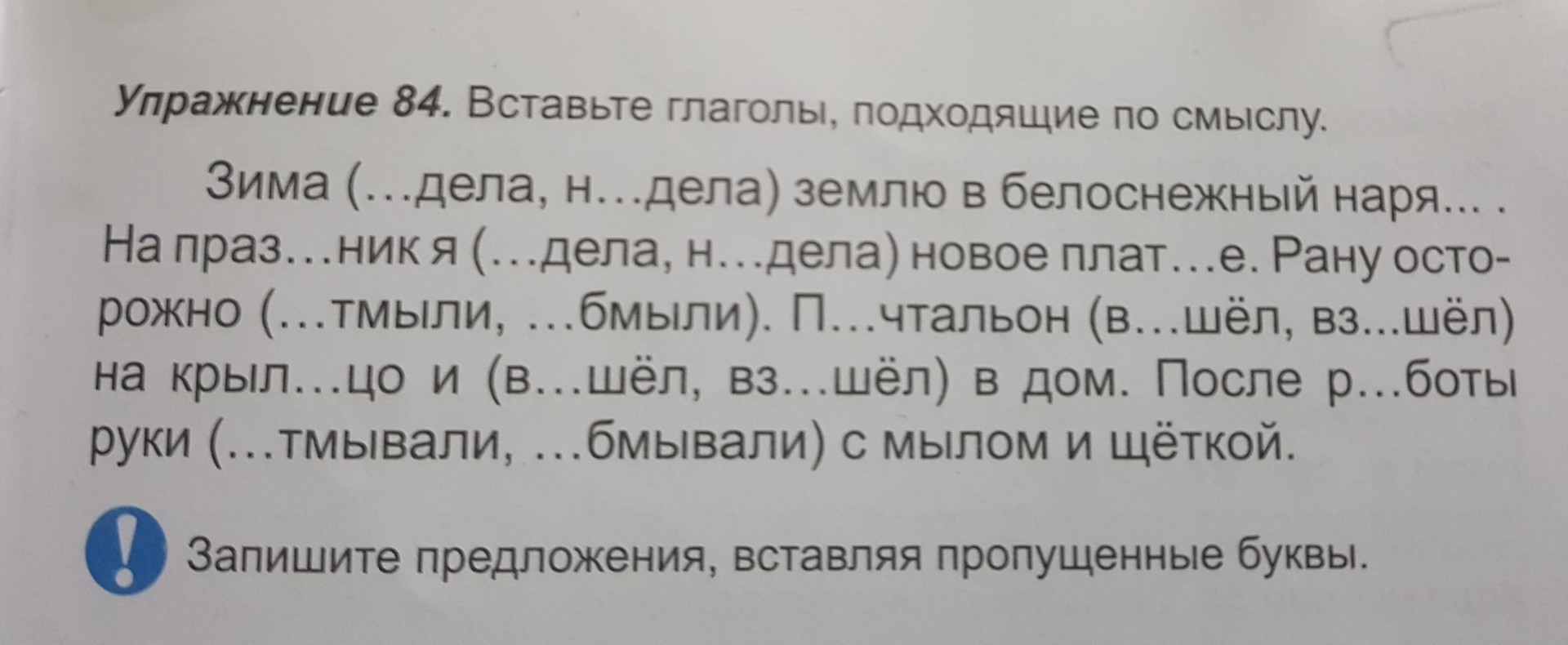 Зима надела землю в белоснежный наряд. На праздник я надела новое платье. Рану осторожно отмыли. Почтальон вышёл на крыльцо и вошёл в дом. После работы руки отмывали с мылом и щёткой.