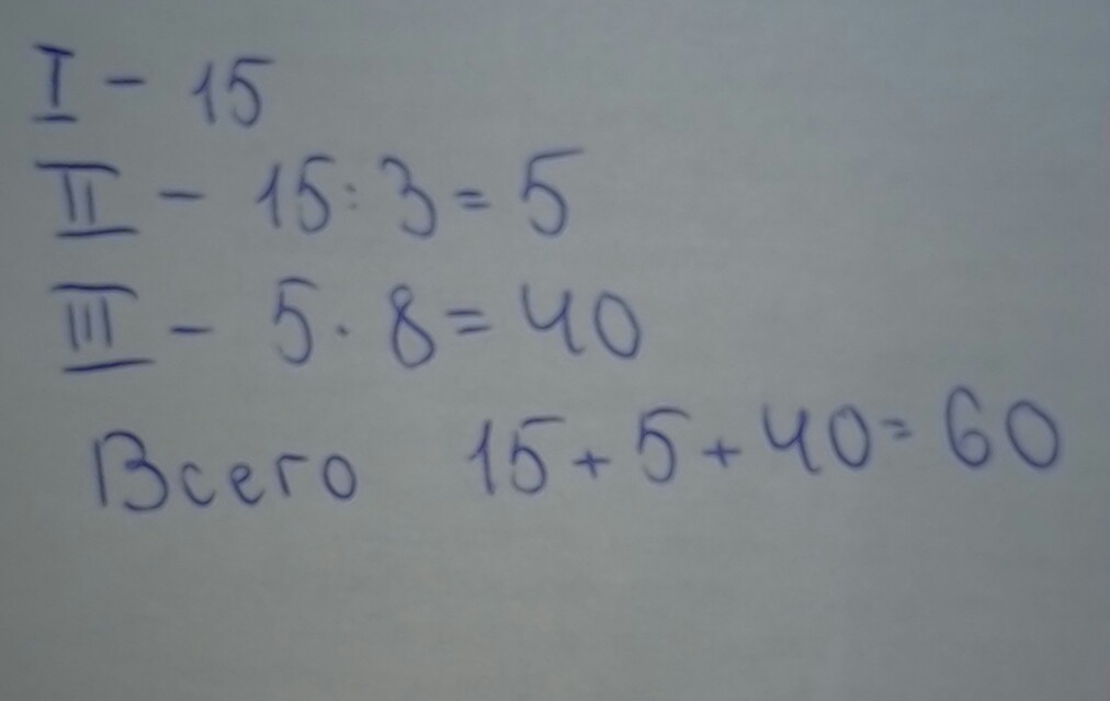 Первое число 15 а второе в3 раза меньше а третье в 8 раза больше чем второе Вичисли сумму этих трёх чисел?