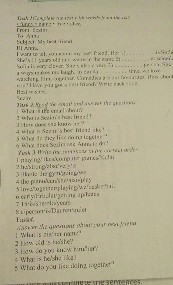 Task 4. 1.My best friend's name is (напиши имя своего лучшего друга) 2.He/she (судя по полу друга, он/она) is ____(возраст) years old. 3.если это однаклассник то I know him/her because we are in the same class. 4.He/she likes ______(что другу нравится ну например playing tennis)