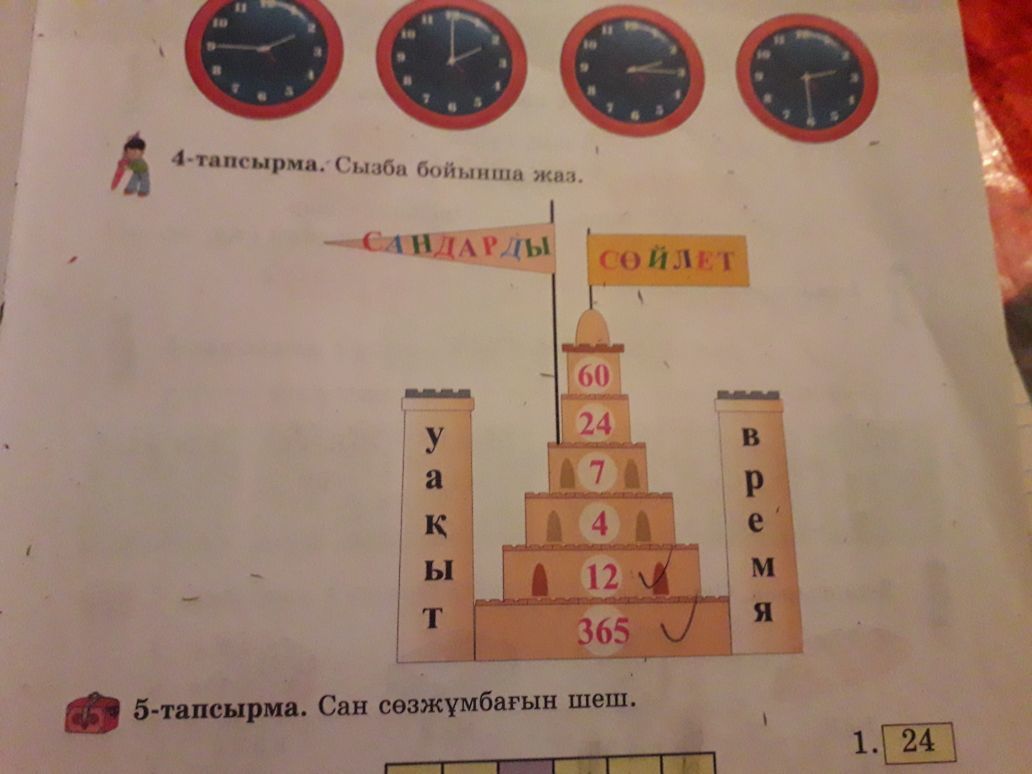 Алпыс минут бір сағатта. жирма төрт сағат бір тәулікте. Жеті күн аптада. Төрт апта бір айда. Он екі ай бір жылда. Үш жүз алпыс бес күн бір жылда