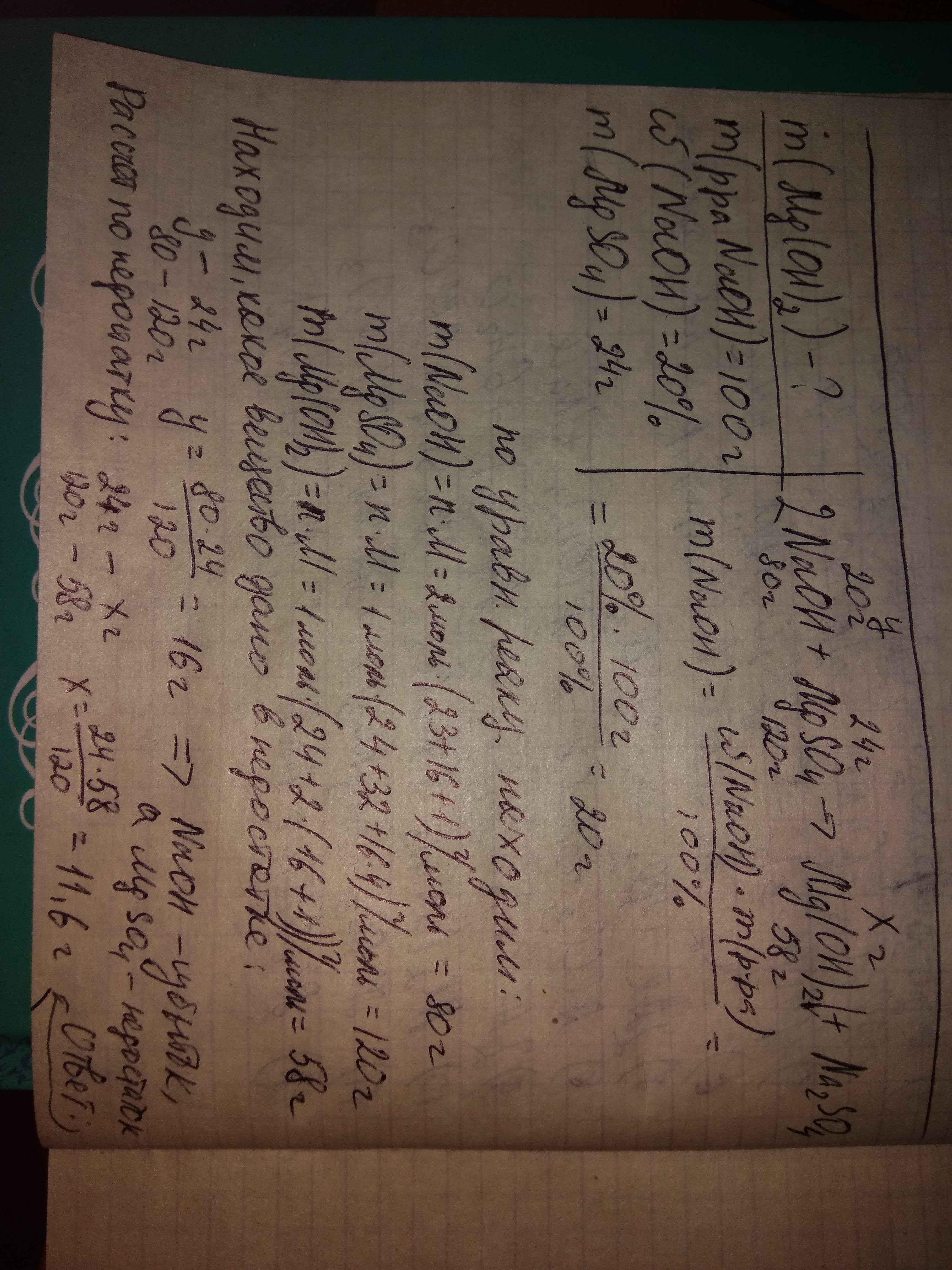 Найти массу осадка который образуется при взаимодействии 100 граммов 20 процентного раствора гидроксида натрия и 24 г сульфата магния
