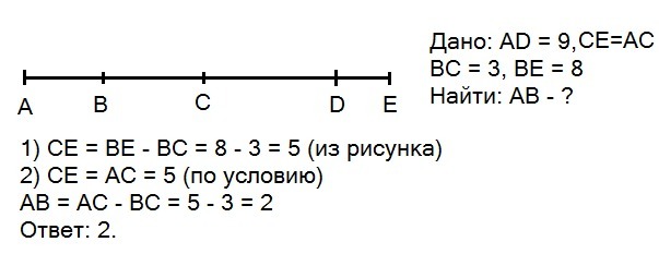 На отрезке AE отмечены точки B, C и D, причём С - середина отрезка AE. Известны длины отрезков: AD=9 см, BE=8 см, BC= 3 см. Найдите длину отрезка AB (в см). Помогите!