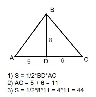 Высота BD треугольника ABC равна 8 см и делит сторону AC на отрезки, равные 5 и 6 см. найдите площадь треугольника