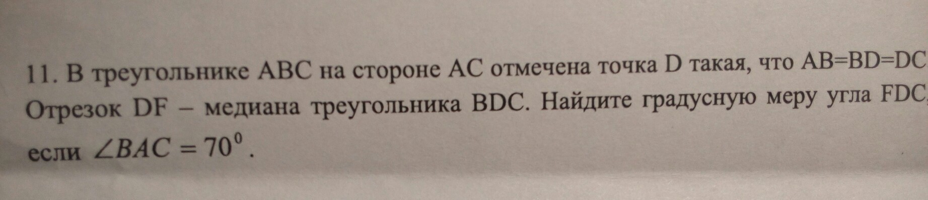 В треугольнике ABC на стороне AC отмечена точка D , такая , что AB=BD=DC. Отрезок DF медиана треугольника BDC. Найдите угол FDC, если угол BAC=70 градусов