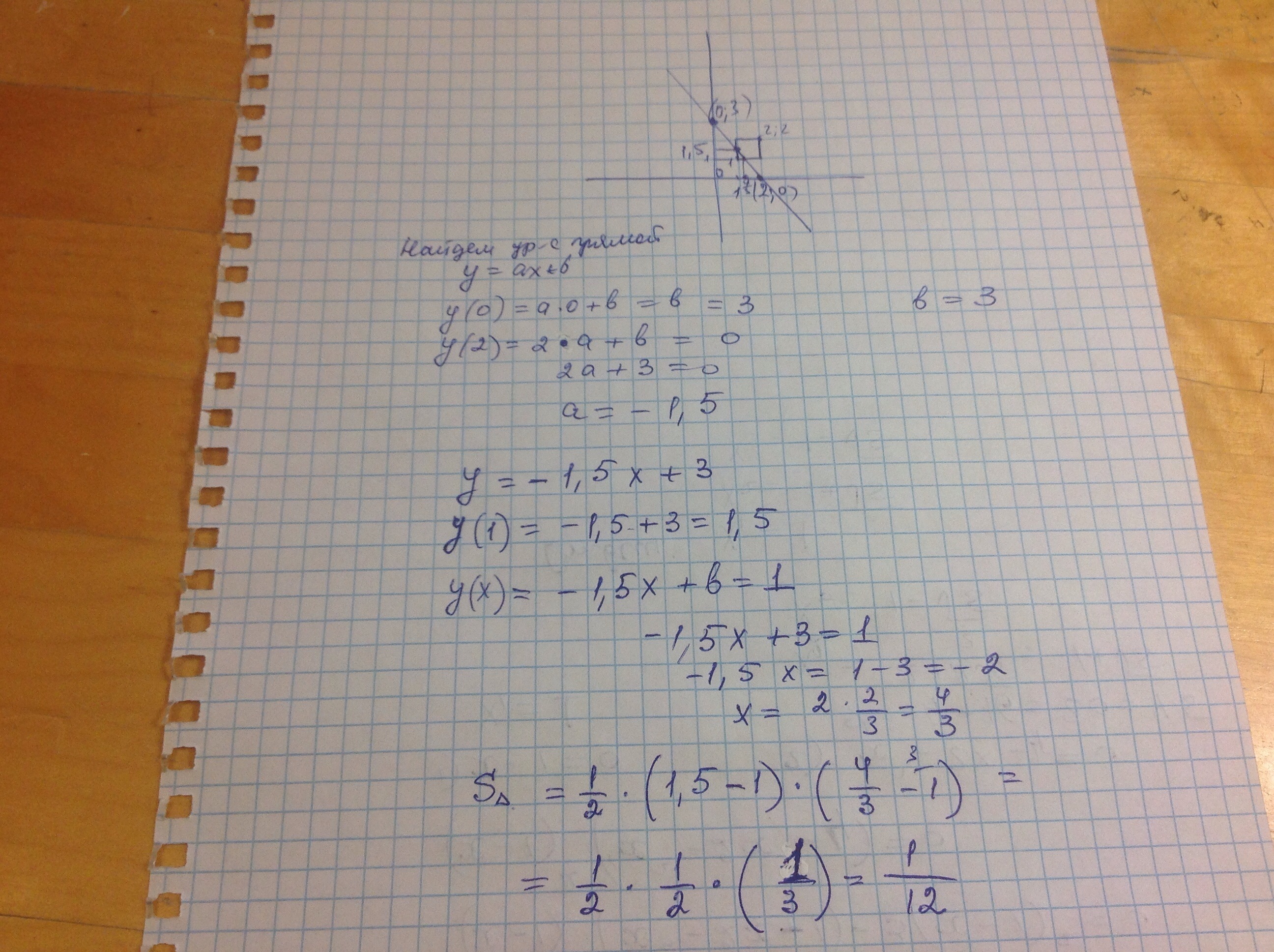 Прямая, проходящая через точки с координатами (0;3) и (2;0) отсекает треугольник от квадрата, две противоположные вершины которого расположены в точках (1;1) и (2;2). Чему равна площадь этого треугольника?