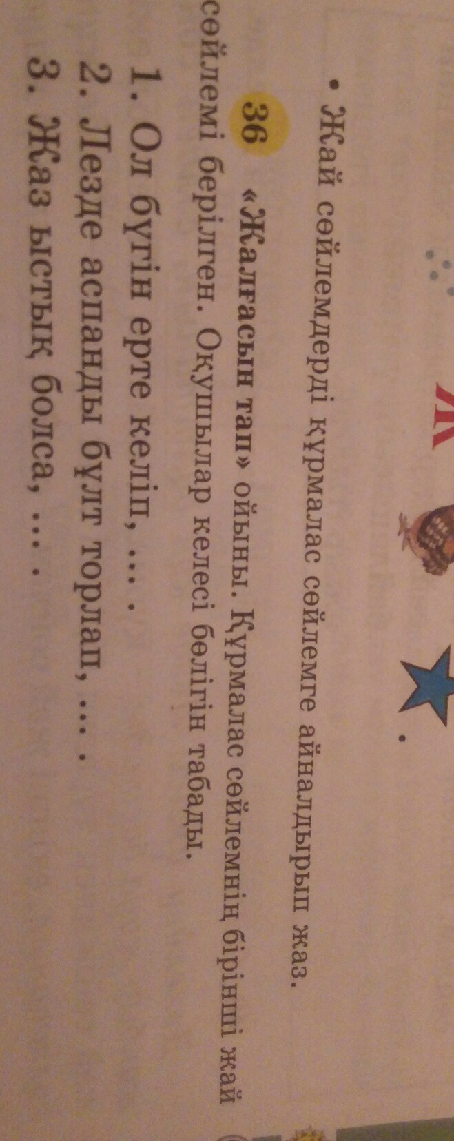 4 сынып. 36 жаттыгу. "жалгасын тап" ойыны. Пожалуйста азанда сабак ал маган уйыктау керек, еш басым жетпей жатыр