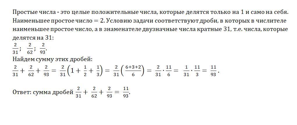 Запишите все возможные обыкновенные дроби, числитель которых равен наименьшему простому числу, а знаменатели-двузначные числа, кратные 31. Найдите значение суммы этих дробей