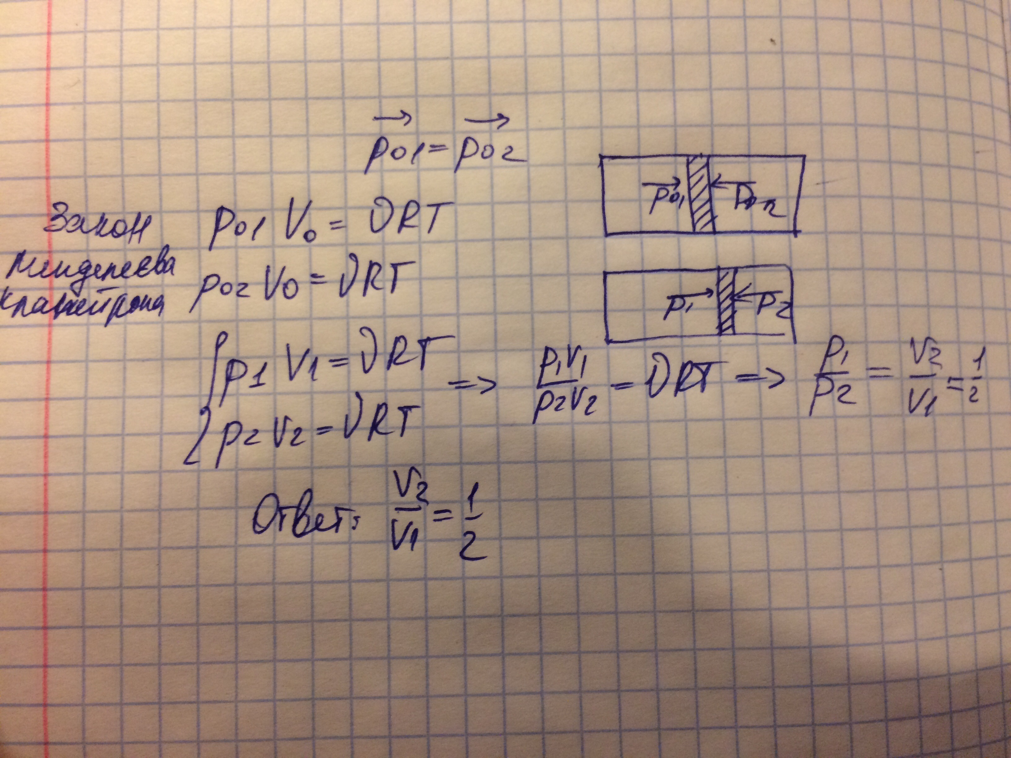 В центре горизонтально расположенного цилиндра,закрытого с обеих сторон,находится поршень.Давление газа в обеих половинка цилиндра одинаково.поршень переместили так что отношение объемов V1/V2=2,при этом температура осталась неизменной, определите отношение давлений Р1/Р2 по обе стороны поршня