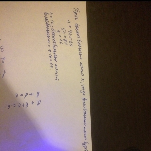 решите задачу по предложеному плану для спортивного клуба купили 80 волейбольных и боскетбольных мячей причем волейбольных в 4 раза больше чем боктебольных сколько волейбольных мячей купили