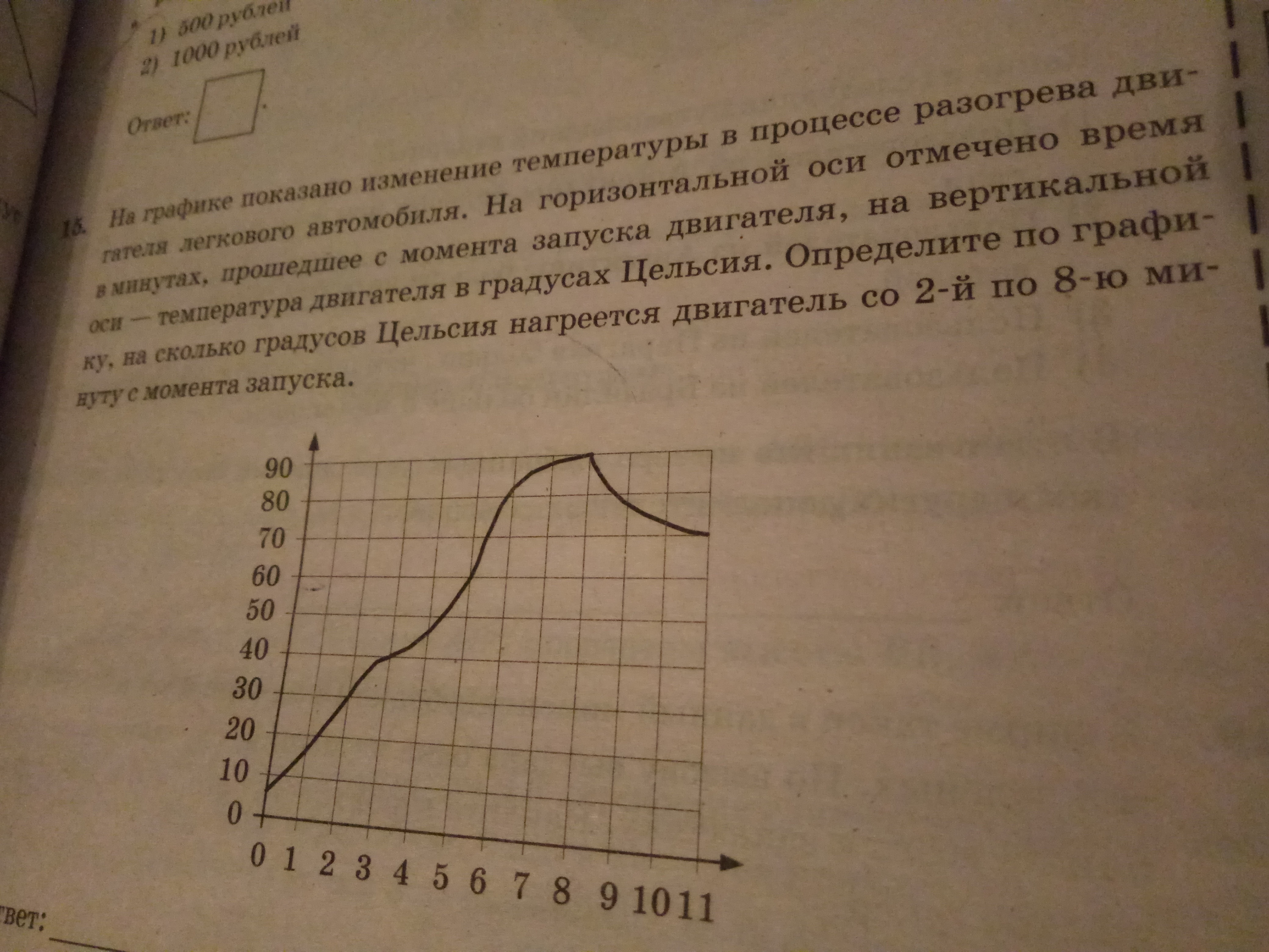 На графике показано изменение температуры в процессе разогрева двигателя легкового автомобиля. На горизонтальной оси отмечено время в минутах, прошедшее с момента запуска двигателя, на вертикальной оси - температура двигателя в градусах Цельсия. Определите по графику, на сколько градусов Цельсия нагреется двигатель со 2-й по 8-ю минуту с момента запуска.