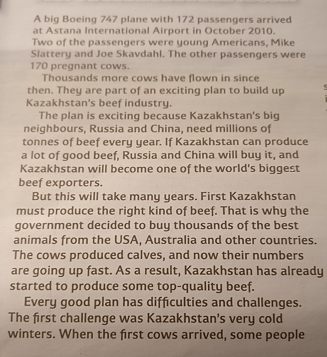 Более тысяч коров было перевезено с того времени.Они являлись частью потрясающего плана по строительству казахстанской мясной индустрии.План восхитителен тем,что большие казахстанские соседи ,Россия и Китай,нуждались в миллионах тонн мяса(говядины) каждый год.Если Казахстану удастся предоставить большое количество хорошего мяса,то Россия и Китай будут покупать его и Казахстан станет одним из самых больших мировых экспортёров мяса(говядины).