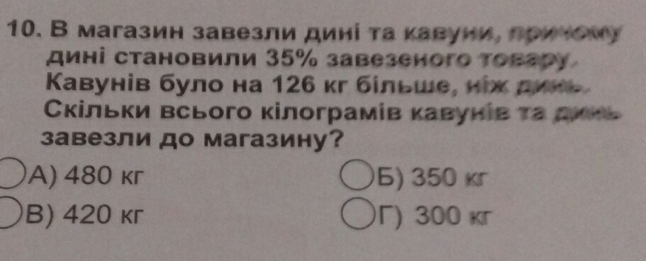 магазин завезли дині та кавуни по чому причому годині становили 35 процентів завезли його товару кавунів було 126 кг більше ніж жита Скільки всього кілограмів кавунів та Динь завезли до магазину?