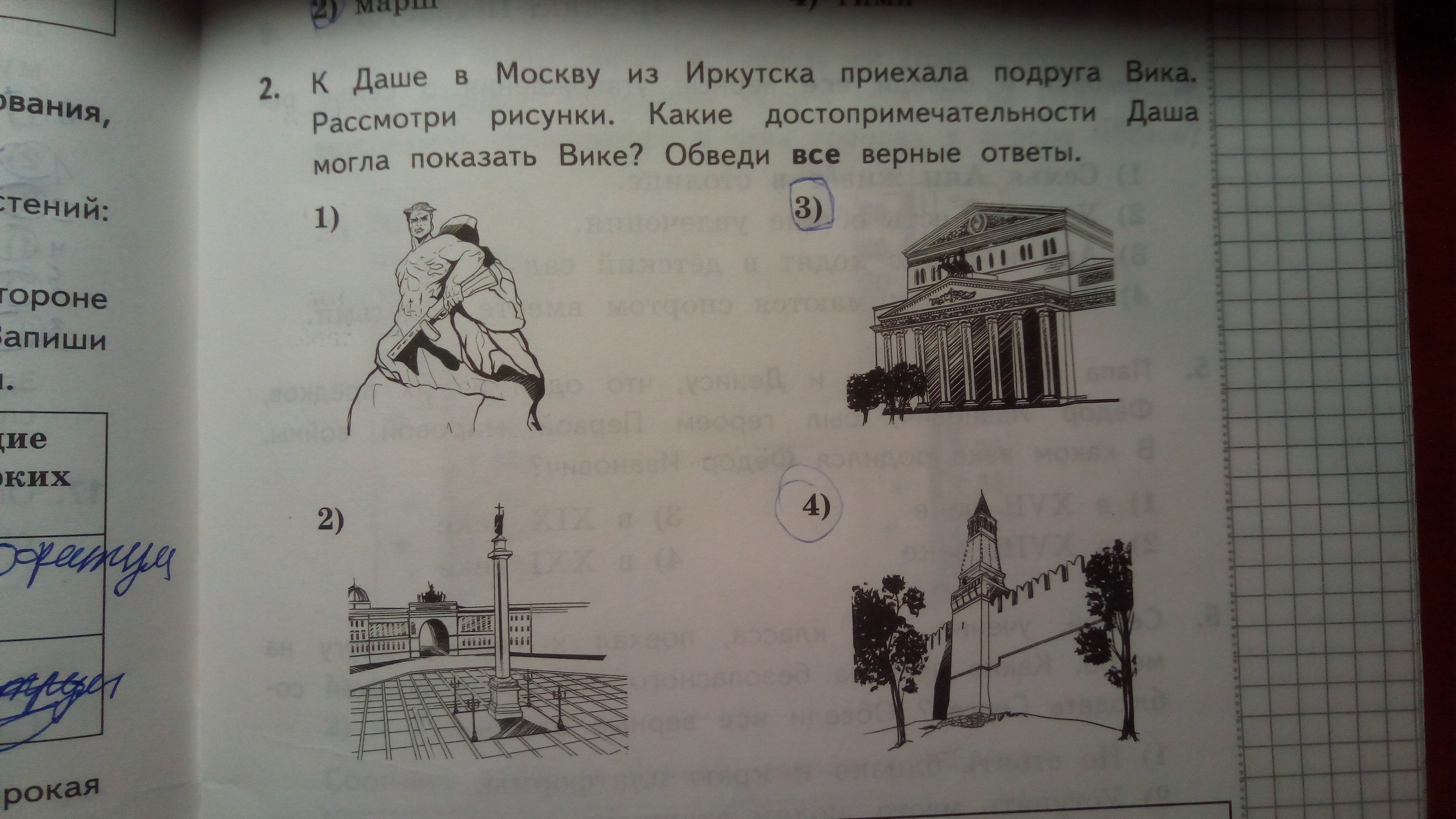 приехала подруга Вика. Рассмотри рисунки. Какие достопримечательности Даша могла показать Вике? Обведи все верные ответы.Помогите пожалуйста!!!!