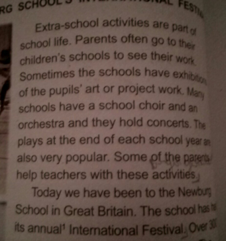 Внеклассные мероприятия - часть школьной жизни. Родители часто ходят в детские школы, чтобы увидеть их. Иногда в школах есть учащиеся художественных или проектных работ учеников. В школах Маш есть школьный хор и оркестр, и они проводят концерты. Спектакли в конце каждого учебного года также очень популярны. Некоторые из педжета помогают учителям в этих мероприятиях. Сегодня мы были в школе Ньюбера в Великобритании. В школе проходит ежегодный международный фестиваль